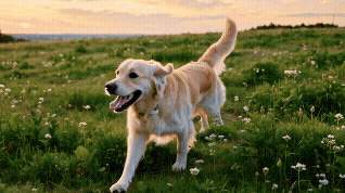 "A majestic golden retriever runs joyfully through a lush green meadow at sunset. The camera smoothly tracks from left to right, with soft golden light shimmering across the dog's fur. Wildflowers gently sway in the breeze, and dust particles glisten in the warm light. Cinematic, ultra-realistic, 4K quality."